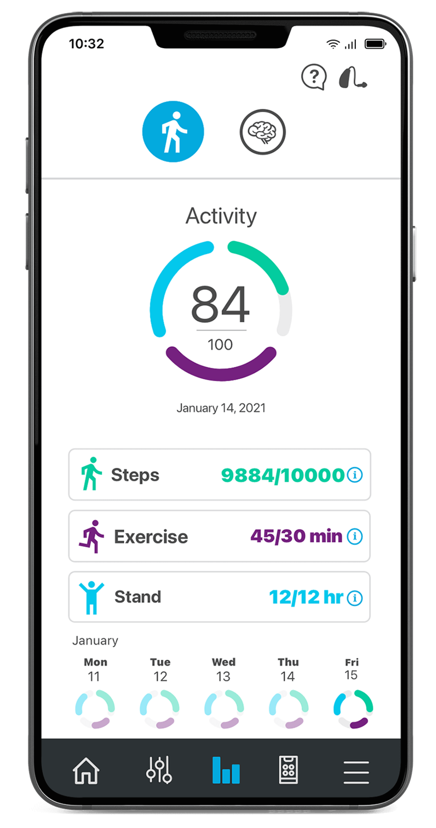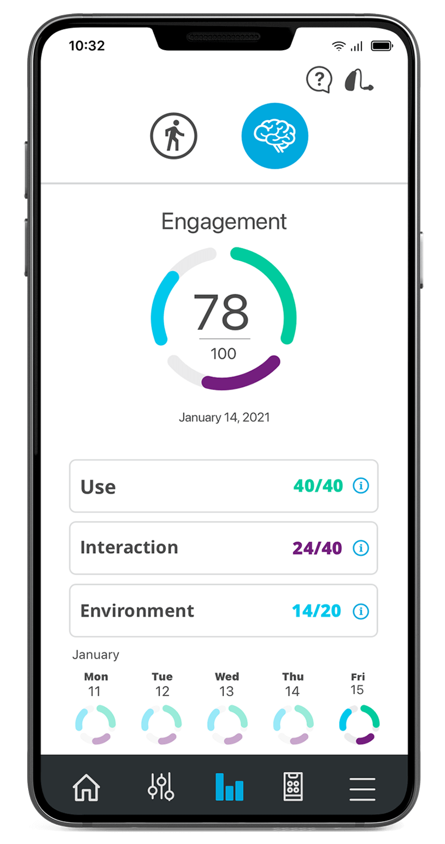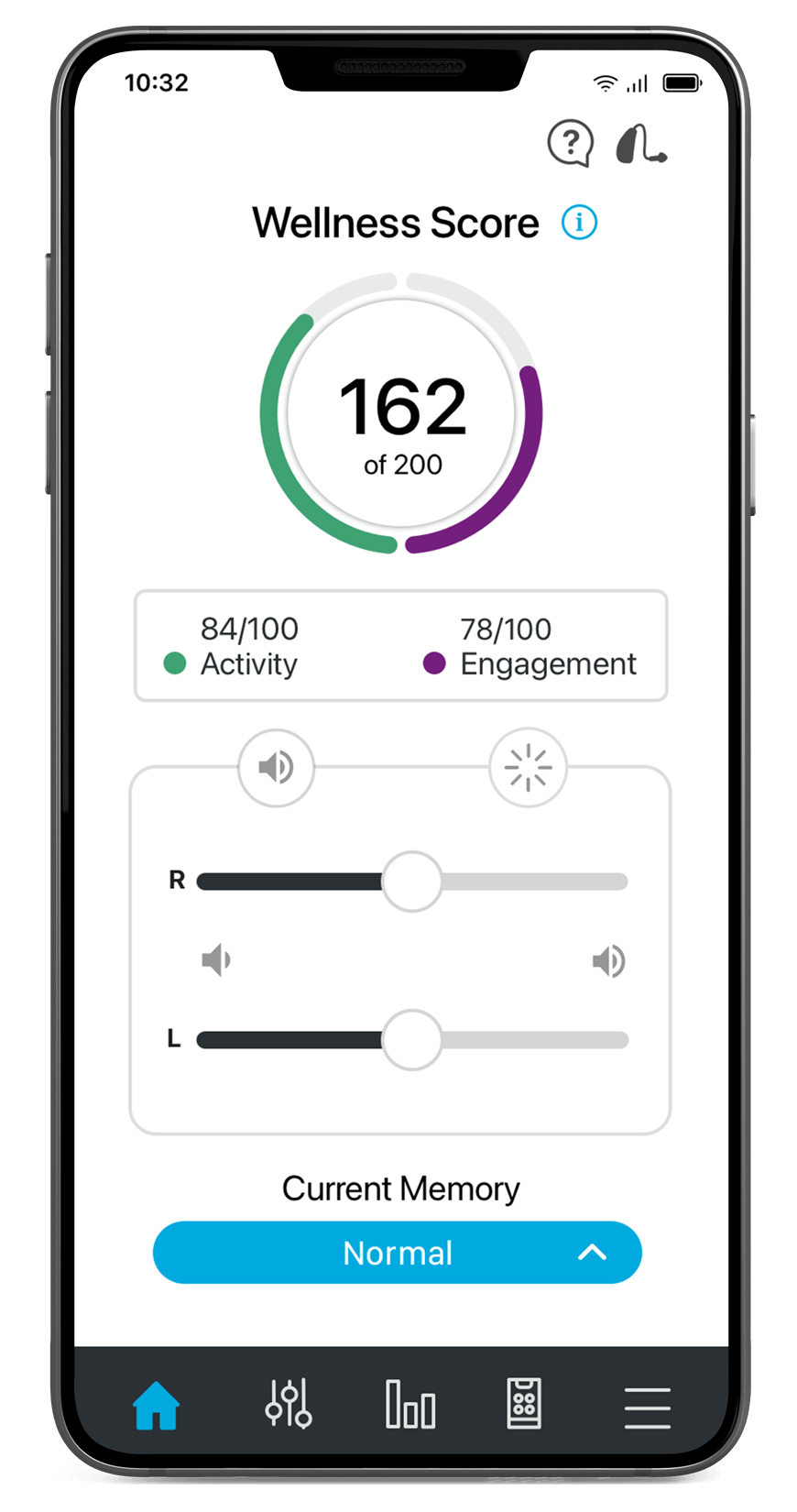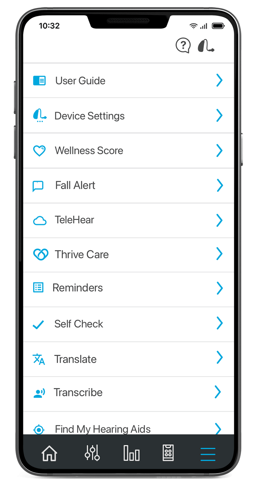 La aplicación Control Auditivo Thrive funciona perfectamente con Evolv AI para darle el control de sus audífonos. Cambie fácilmente la configuración, ajuste el volumen, cree memorias personalizadas y mucho más.